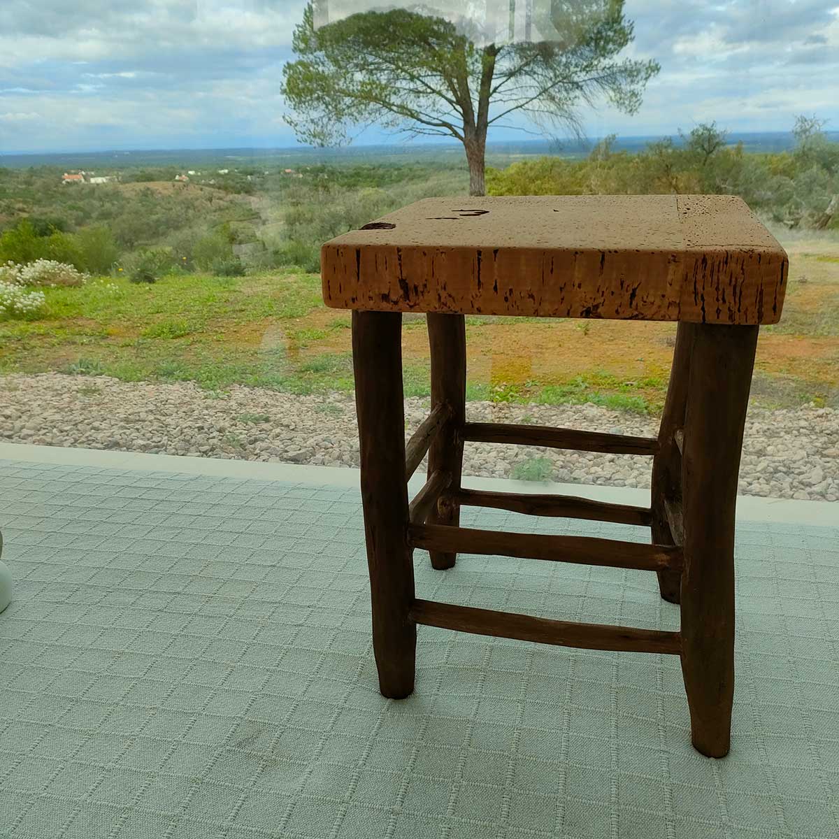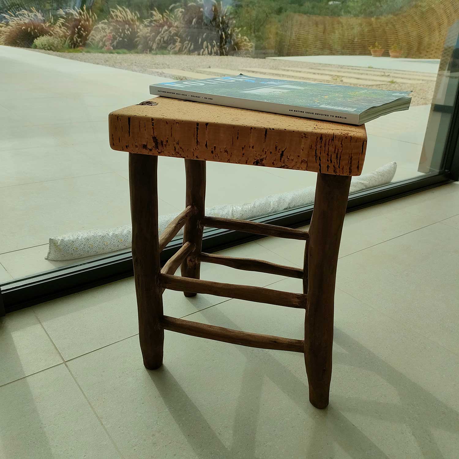 Natural cork stool with recycled wood structure.